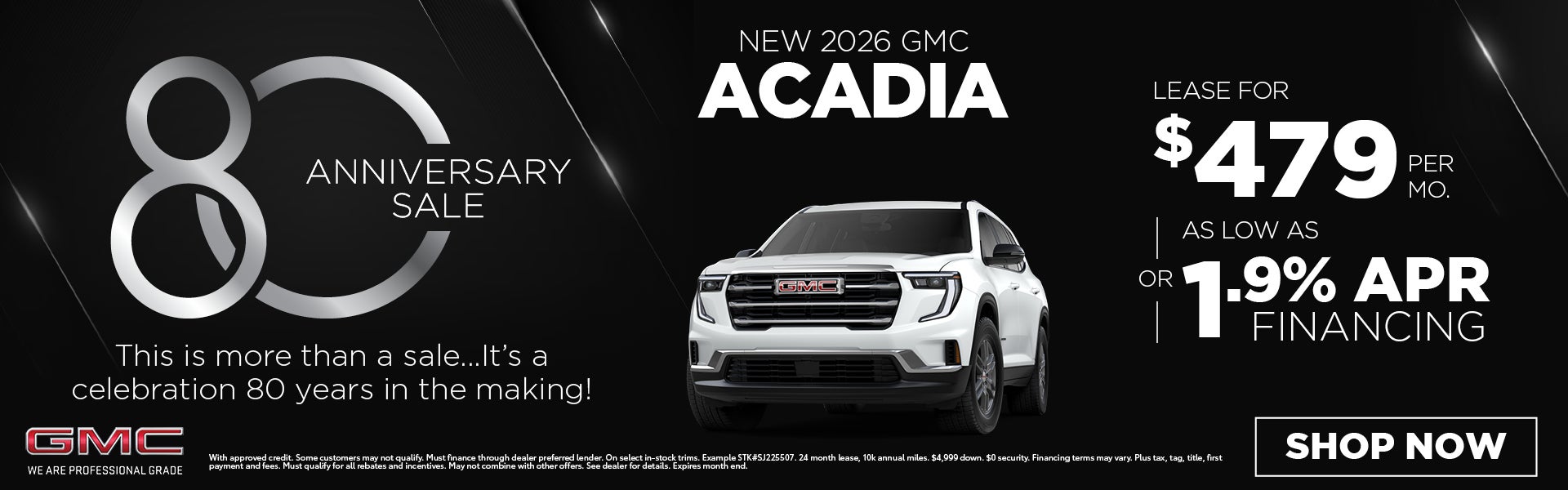 With approved credit. Some customers may not qualify. Must finance through dealer preferred lender. On select in-stock trims. Example STK#SJ225507. 24 month lease, 10k annual miles. $4,999 down. Financing terms may vary. $0 security. Plus tax, tag, title, first payment and fees. Must qualify for all rebates and incentives. May not combine with other offers. See dealer for details. Expires 3/31/26.