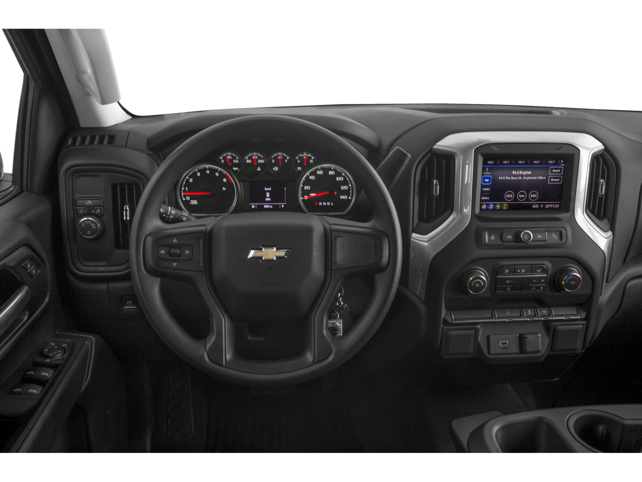 or-Keyed Carpeting Floor Covering, Compass, Deep-Tinted Glass, Electronic Cruise Control, Front Rubberized Vinyl Floor Mats, Manual Tilt Wheel Steering Column, Power Door Locks, Power Front Windows w/Driver Express Up/Down, Power Front Windows w/Passenger Express Down, Power Rear Windows w/Express Down, Rear 60/40 Folding Bench Seat (Folds Up), Rear Rubberized-Vinyl Floor Mats, Remote Keyless Entry, and Standard Tailgate), Safety Confidence Package (4.2 Diagonal Color Display Driver Info Center, Automatic Emergency Braking, Forward Collision Alert, Front Pedestrian Braking, and Steering Wheel Audio Controls), Trailering Package (Hitch Guidance), 10-Way Power Driver Seat w/Lumbar, 120-Volt Bed Mounted Power Outlet, 120-Volt Instrument Panel Power Outlet, 3.42 Rear Axle Ratio, 4-Wheel Disc Brakes, 40/20/40 Front Split Bench Seat, 6 Speakers, 6-Speaker Audio System, ABS brakes, Air Conditioning, Alloy wheels, AM/FM radio: SiriusXM, Apple CarPlay/Android Auto, Brake assist, Bumpers: body-color, Cloth Seat Trim, Delay-off headlights, Driver door bin, Driver vanity mirror, Dual front impact airbags, Dual front side impact airbags, Electronic Stability Control, Front anti-roll bar, Front Black Bowtie Emblem (LPO), Front Center Armrest w/Storage, Front reading lights, Front wheel independent suspension, Fully automatic headlights, Heated door mirrors, Heavy Duty Suspension, Illuminated entry, Low tire pressure warning, Multi-Flex Tailgate, Occupant sensing airbag, Outside temperature display, Overhead airbag, Overhead console, Panic alarm, Passenger door bin, Passenger vanity mirror, Power door mirrors, Pow